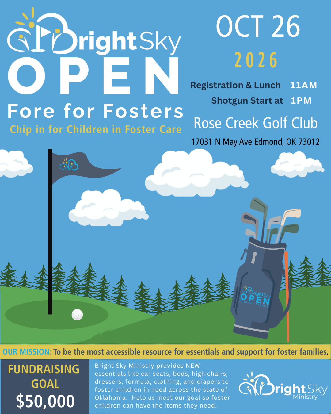 “Chip in for Kids in Care” and join us on Monday, October 26th 2026 for the Bright Sky Open Fore For Fosters Golf Tournament at Rose Creek Golf Club.  Click here to purchase tickets or become a sponsor!